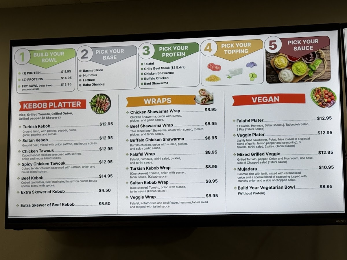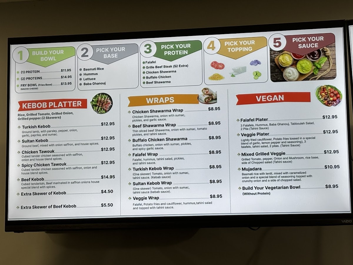 Thin sliced beef shawarma, onion with sumac, tomato pickles and tahini sauce.